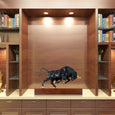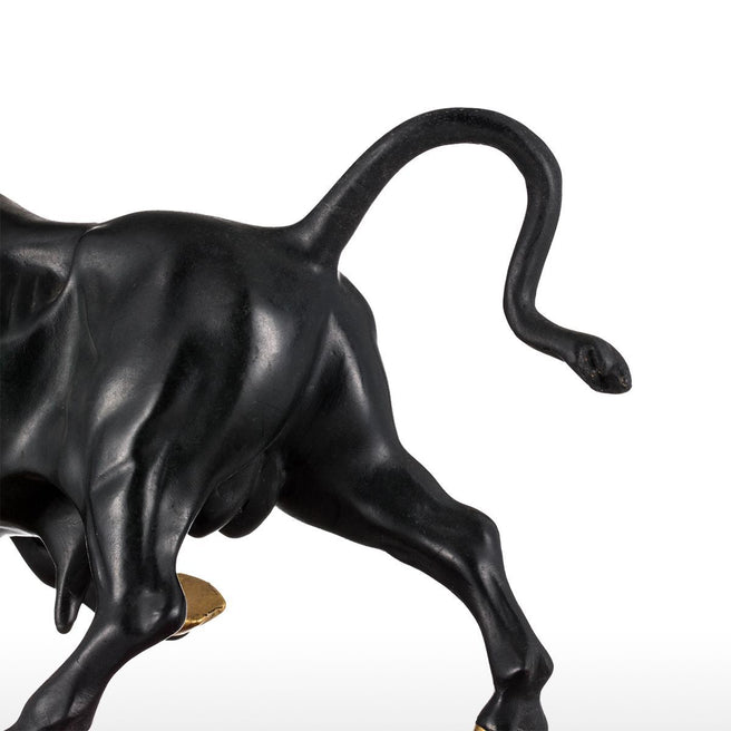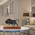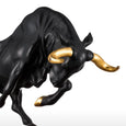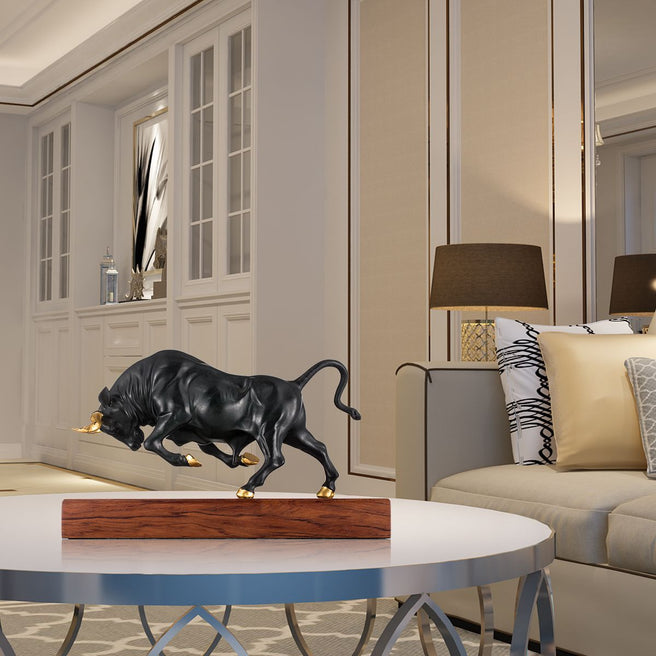 Demonstrate your fierce momentum and motivation in life, with our momentum bull sculpture. Colors are black and gold, blending in well with any environment. Made of copper and gleams wherever you wish to put it. We suggest rooms such as your living room or study room, to entertain guests. Dimensions are 32cm by 10cm by 20cm.